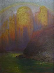 Parsifal erblickt die Gralsburg - Dieses vermutlich späte Ölgemälde befindet sich heute in Polen in Privatbesitz. Die hier vorliegende Abbildung wurde uns Anfang Januar 2006 zu Verfügung gestellt. Es ist das erste Gemälde der Sagenhalle was bis lang wieder entdeckt wurde. |